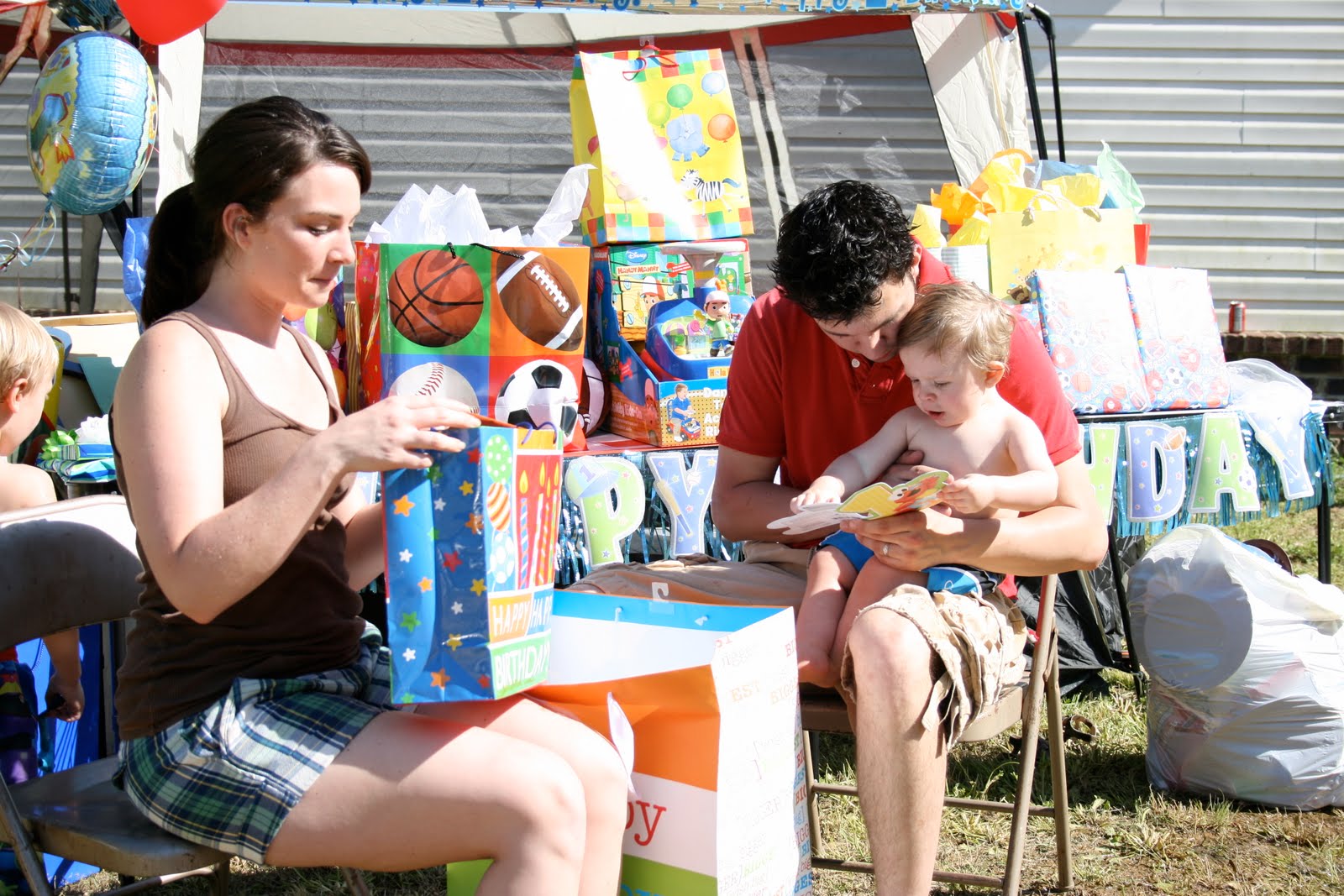 This afternoon we went to Axton's 1st Birthday party! The kids and I had a blast and it was great weather for an outside party! They had a bouncer, a slip-n-slide, a little pool and lots of goodies to eat. Axton got lots of good things...too bad he is too young to know!