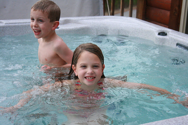 The cabin was great but the first thing they wanted to see was the hot tub that Lolli had told them about. Within just a few minutes they were changed and trying it out...